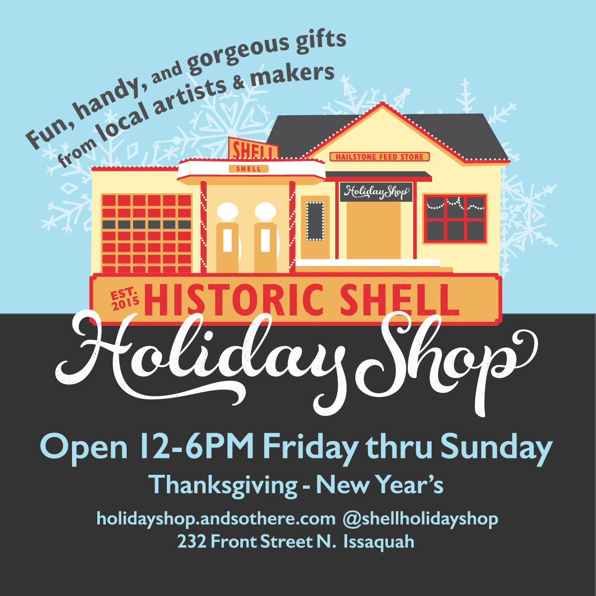 Every holiday season, Alison Lang of And So There curates and runs a holiday pop-up shop out of an historical Shell gas station space in downtown Issaquah. This year, Water’s Edge as well as a special framed winter artwork by yours truly are on sale there!